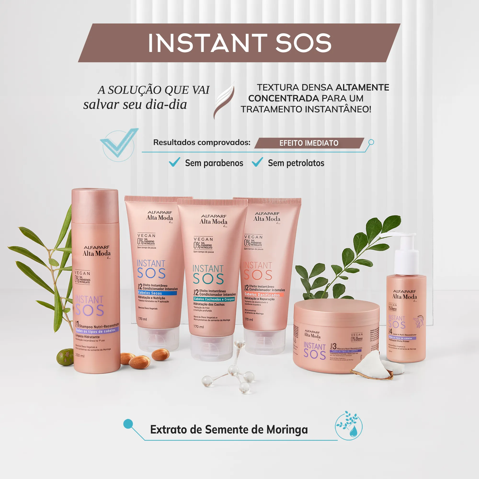 Após utilizar o Shampoo Instant SOS, retire o excesso de água e aplique o Condicionador Instant SOS Cabelos Cacheados por todo o cabelo, massageando suavemente. Sinta o desembaraço instantâneo dos fios, não precisa de pausa! Enxague e finalize com o Leave-in Nutri Reconstrutor.