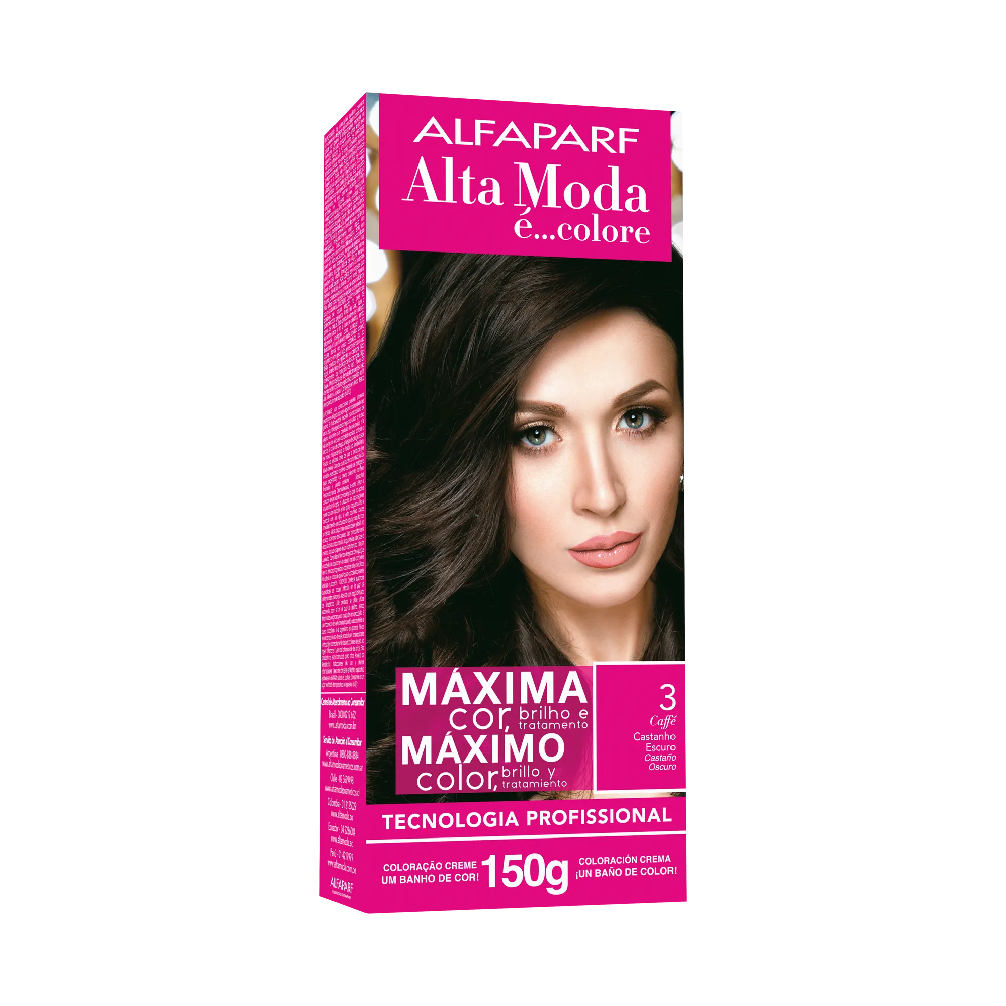 Alta Moda é... coloración en crema. Tecnología Profesional Italiana. Máximo color, brillo y tratamiento. La única con 150 g. Cobertura perfecta de las canas. Pigmentos micronizados concentrados, que se fijan en las capas más profundas del cabello y se depositan allí definitivamente, para dar un nuevo color y una nueva vida al cabello.