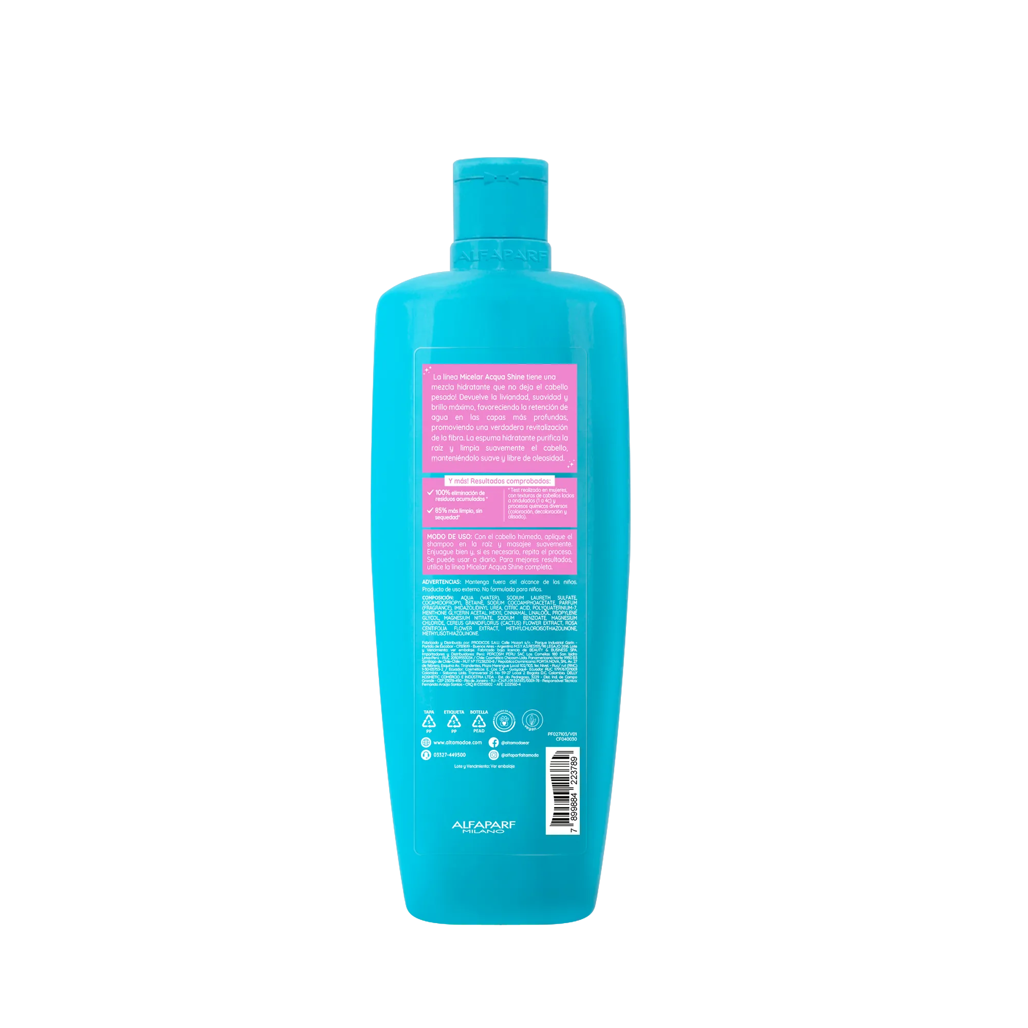 ¡Alta Moda Micelar Acqua Shine tiene una mezcla hidratante que no deja el cabello pesado! Devuelve la liviandad, suavidad y brillo máximo, favoreciendo la retención de agua en las capas más profundas, promoviendo una verdadera revitalización de la fibra! 100% eliminación de residuos acumulados en el cabello* 85% más limpio sin sequedad* *Test realizado en mujeres, con texturas de cabello lacios a ondulados (1 a 4c) y procesos químicos diversos (decoloración, coloración y alisado)