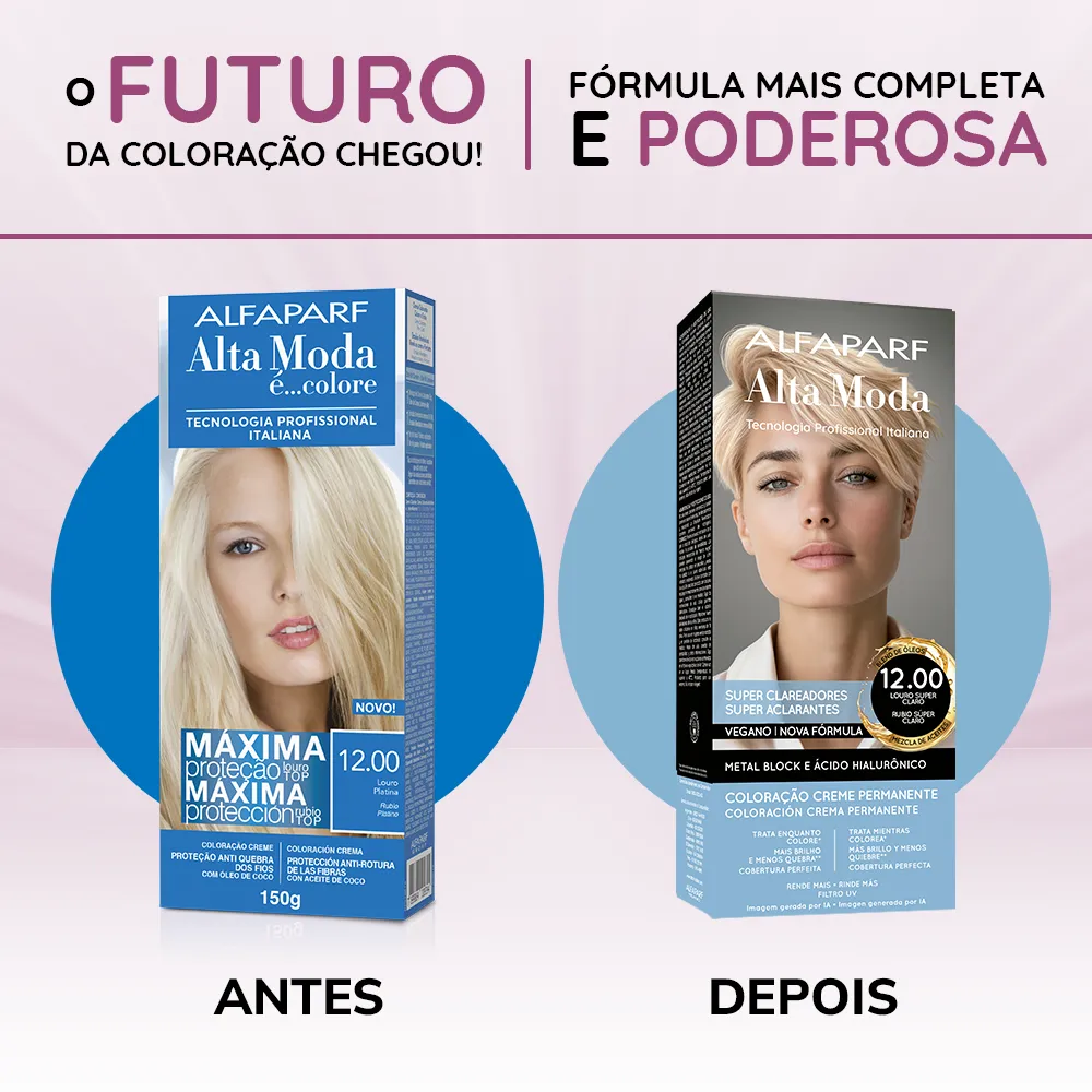 COMPOSIÇÃO / COMPOSICIÓN: Coloração Creme Permanente / Coloración Crema Permanente Alfaparf Alta Moda - Proc. ANVISA n˚.: 25351.451050/2024-88 - AQUA (WATER), CETEARYL ALCOHOL, PROPYLENE GLYCOL, AMMONIA, CETEARETH-50, PEG-40 HYDROGENATED CASTOR OIL, LAURYL ALCOHOL, PARFUM (FRAGRANCE), MYRISTYL ALCOHOL, COCAMIDOPROPYL BETAINE, SODIUM SULFITE, ERYTHORBIC ACID, POLYQUATERNIUM-22, ETHANOLAMINE, EDTA, BISABOLOL, AMYL SALICYLATE, 2-METHYLRESORCINOL, P-PHENYLENEDIAMINE, ETHYLHEXYL METHOXYCINNAMATE, 2,4-DIAMINOPHENOXYETHANOL HCL, HELIANTHUS ANNUUS (SUNFLOWER) SEED OIL, GLYCERIN, COCOS NUCIFERA (COCONUT) OIL, LINUM USITATISSIMUM (LINSEED) SEED OIL, SODIUM PCA, SODIUM LACTATE, SOY AMINO ACIDS, ARGININE, WHEAT AMINO ACIDS, ASPARTIC ACID, PCA, SERINE, THREONINE, ARGANIA SPINOSA KERNEL OIL, MACADAMIA TERNIFOLIA SEED OIL, OLEA EUROPAEA (OLIVE) FRUIT OIL, PERSEA GRATISSIMA (AVOCADO) OIL, ARGININE HCL, PENTYLENE GLYCOL, SODIUM HYALURONATE CROSSPOLYMER, HYDROLYZED RICE PROTEIN, PHYTIC ACID, ORYZA SATIVA (RICE) EXTRACT, GLYCINE, ALANINE, VALINE, SODIUM BENZOATE, ISOLEUCINE, PROLINE, TOCOPHEROL, HISTIDINE, PHENYLALANINE, POTASSIUM SORBATE.