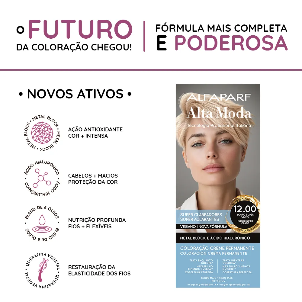 Coloração Creme Permanente que entrega cores intensas, vibrantes e com aparência mais saudável. Sua fórmula exclusiva combina a Tecnologia Metal Block, com ação antioxidante que ajuda a remover o acúmulo de metais pesados e impurezas dos fios, com o poder do Ácido Hialurônico, que garante maciez, sedosidade e proteção da cor. É enriquecida com um Blend de Óleos Nutritivos, composto por coco, macadâmia, oliva, abacate, girassol e argan, que proporcionam nutrição profunda, flexibilidade e fios visivelmente mais saudáveis.