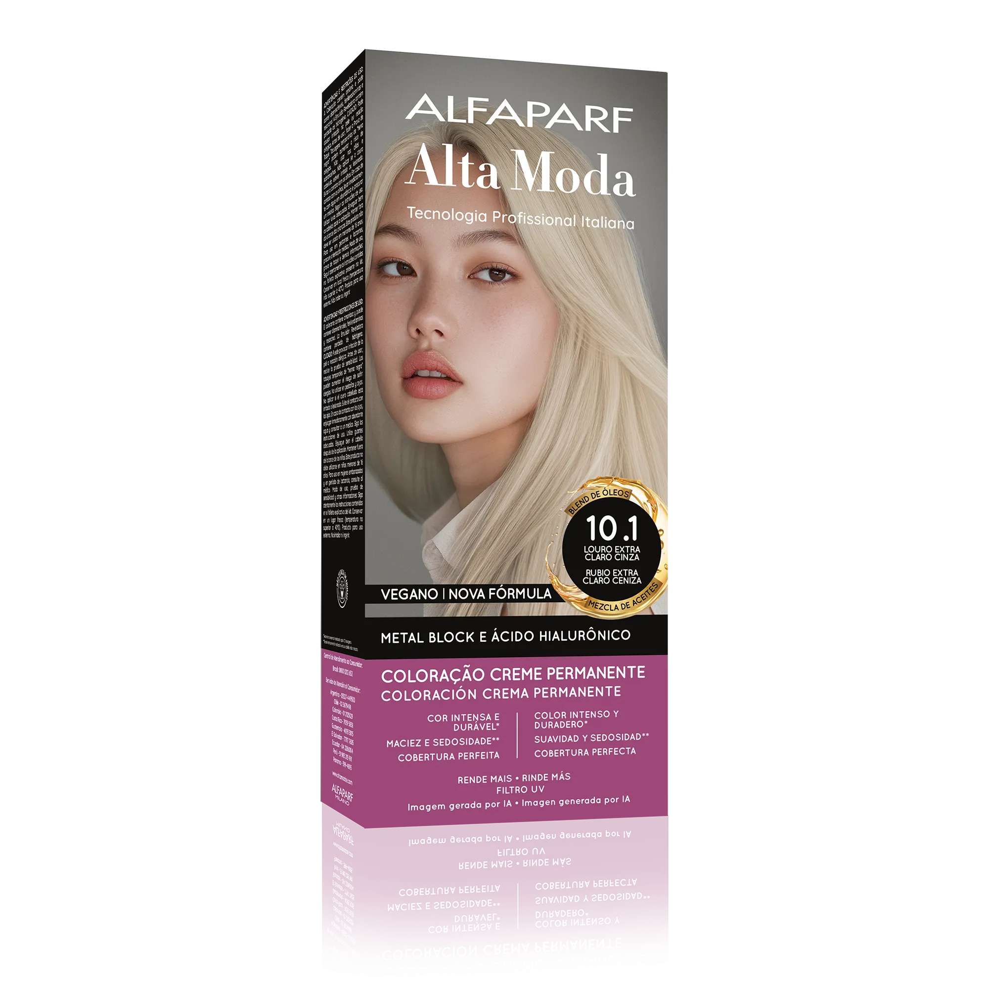 COMPOSIÇÃO / COMPOSICIÓN: Coloração Creme Permanente / Coloración Crema Permanente Alfaparf Alta Moda - Proc. ANVISA n˚.: 25351.451050/2024-88 - AQUA (WATER), CETEARYL ALCOHOL, PROPYLENE GLYCOL, CETEARETH-50, PEG-40 HYDROGENATED CASTOR OIL, AMMONIA, LAURYL ALCOHOL, MYRISTYL ALCOHOL, COCAMIDOPROPYL BETAINE, SODIUM SULFITE, PARFUM (FRAGRANCE), ERYTHORBIC ACID, POLYQUATERNIUM-22, ETHANOLAMINE, EDTA, BISABOLOL, P-PHENYLENEDIAMINE, RESORCINOL, 2-METHYLRESORCINOL, AMYLSALICYLATE, P-AMINOPHENOL, 2,4-DIAMINOPHENOXYETHANOL HCL, ETHYLHEXYL METHOXYCINNAMATE, HELIANTHUS ANNUUS (SUNFLOWER) SEED OIL, GLYCERIN, COCOS NUCIFERA (COCONUT) OIL, LINUM USITATISSIMUM (LINSEED) SEED OIL, SODIUM PCA, SODIUM LACTATE, SOY AMINOACIDS, ARGININE, WHEAT AMINOACIDS, ASPARTIC ACID, PCA, SERINE, THREONINE, ARGANIA SPINOSA KERNEL OIL, MACADAMIA TERNIFOLIA SEED OIL, OLEA EUROPAEA (OLIVE) FRUIT OIL, PERSEA GRATISSIMA (AVOCADO) OIL, ARGININE HCL, PENTYLENE GLYCOL, SODIUM HYALURONATE CROSSPOLYMER, HYDROLYZED RICE PROTEIN, PHYTIC ACID, ORYZA SATIVA (RICE) EXTRACT, GLYCINE, ALANINE, VALINE, SODIUM BENZOATE, ISOLEUCINE, PROLINE, TOCOPHEROL, HISTIDINE, PHENYLALANINE, POTASSIUMSORBATE.