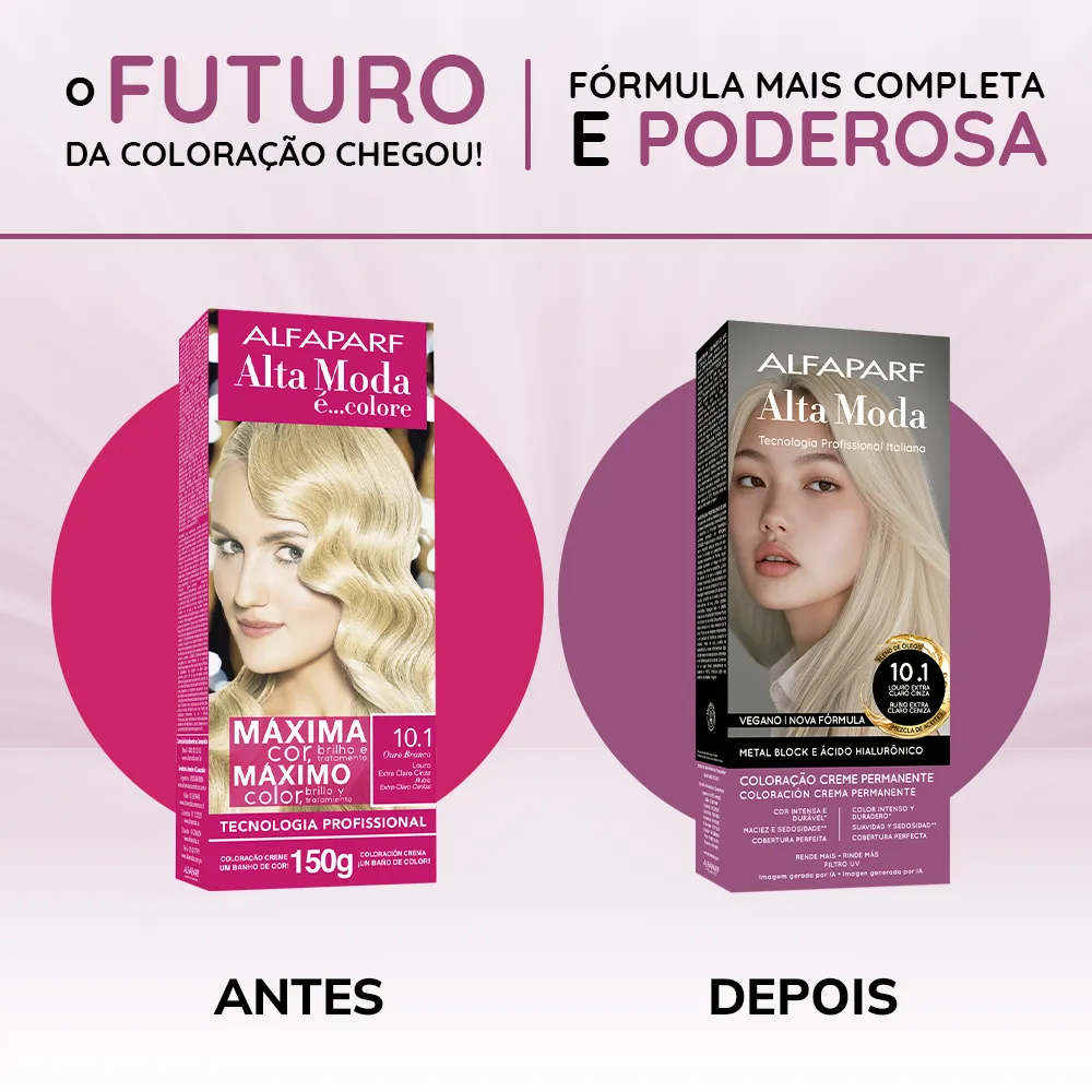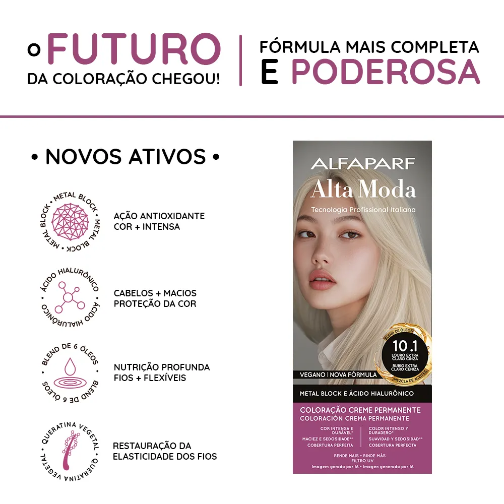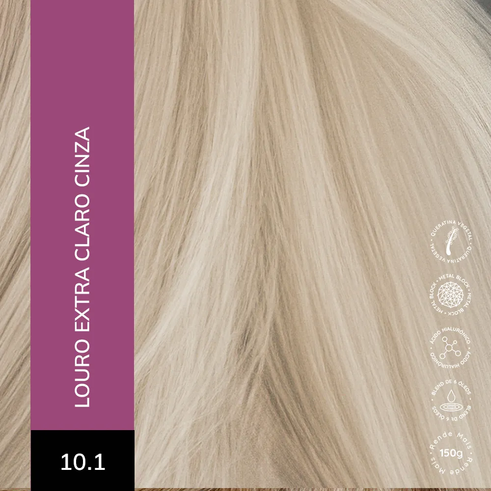 Coloração Creme Permanente que entrega cores intensas, vibrantes e com aparência mais saudável. Sua fórmula exclusiva combina a Tecnologia Metal Block, com ação antioxidante que ajuda a remover o acúmulo de metais pesados e impurezas dos fios, com o poder do Ácido Hialurônico, que garante maciez, sedosidade e proteção da cor. É enriquecida com um Blend de Óleos Nutritivos, composto por coco, macadâmia, oliva, abacate, girassol e argan, que proporcionam nutrição profunda, flexibilidade e fios visivelmente mais saudáveis.