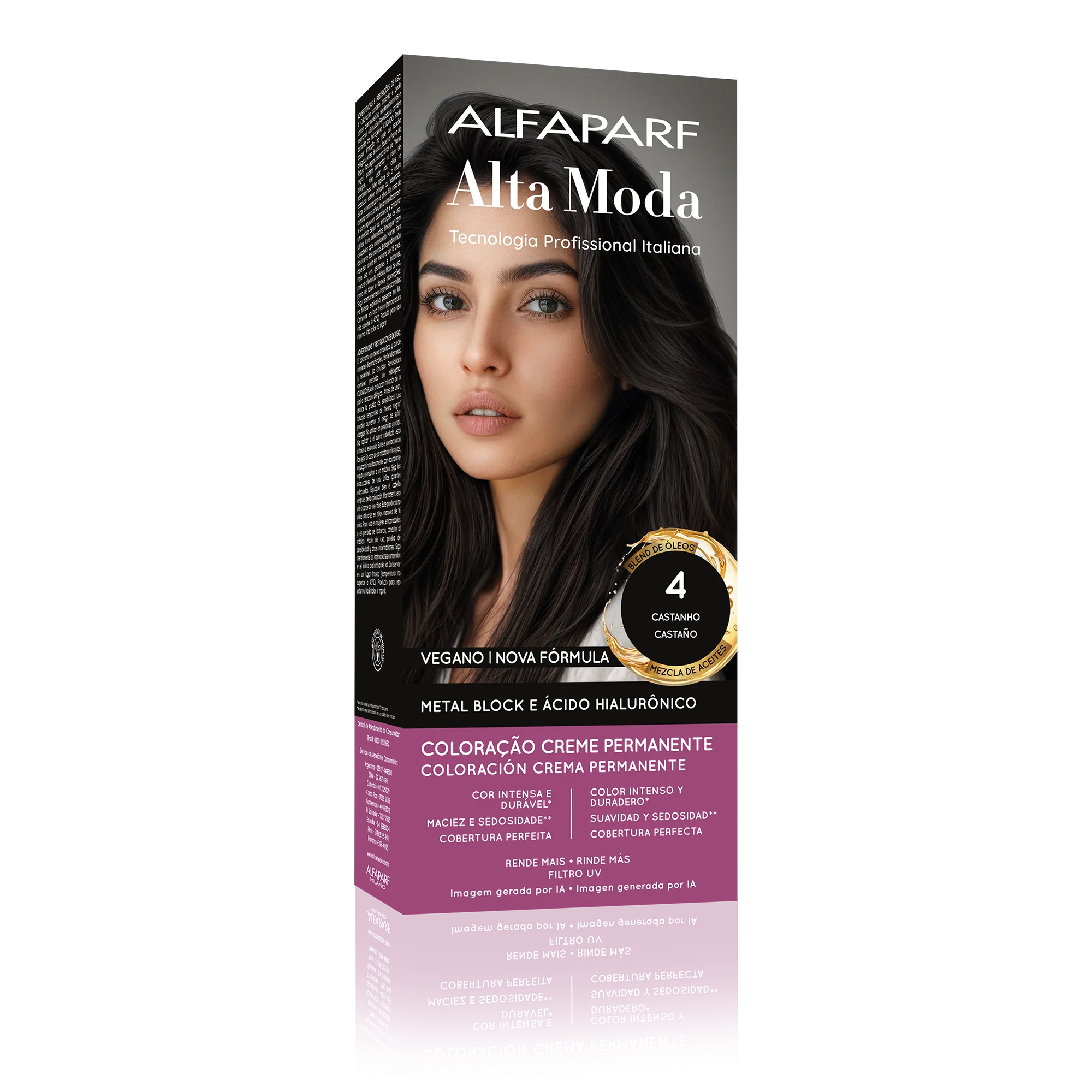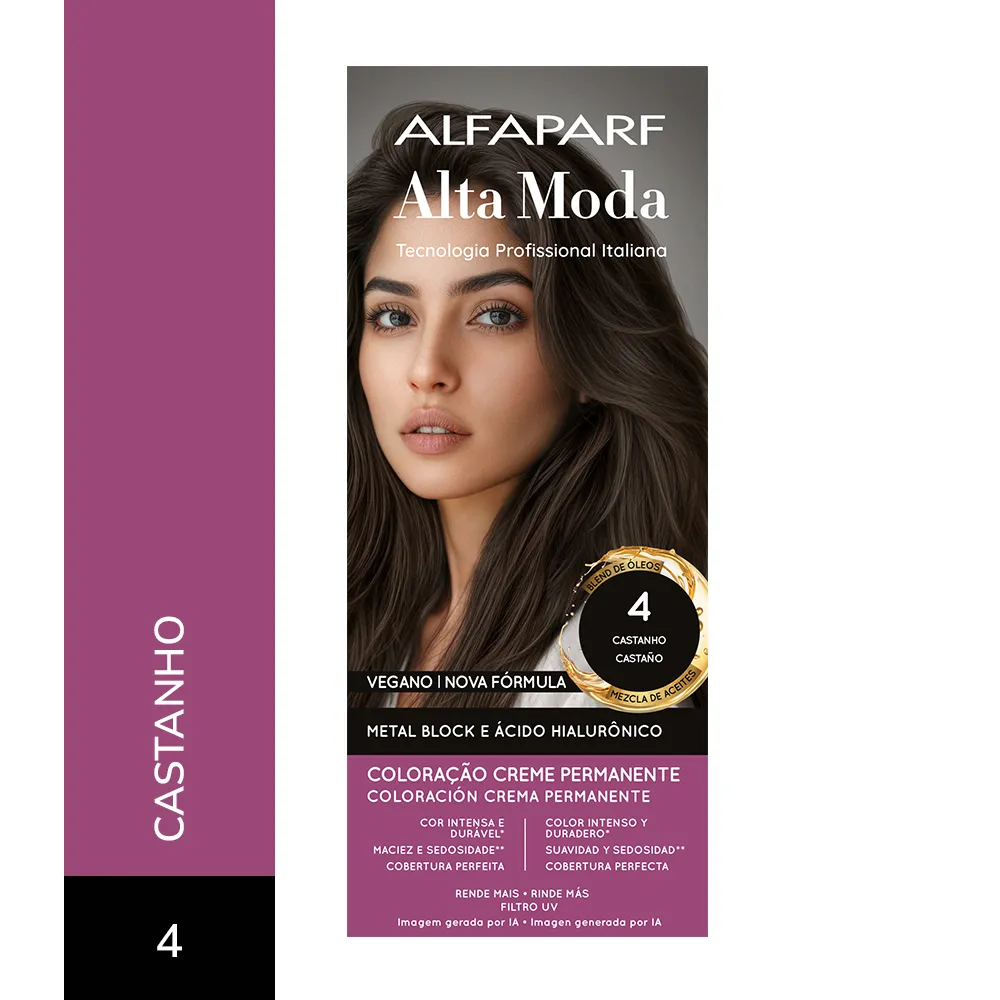 COMPOSIÇÃO / COMPOSICIÓN: Coloração Creme Permanente / Coloración Crema Permanente Alfaparf Alta Moda - Proc. ANVISA n˚.: 25351.451050/2024-88 - AQUA (WATER), CETEARYL ALCOHOL, PROPYLENE GLYCOL, CETEARETH-50, PEG-40 HYDROGENATED CASTOR OIL, AMMONIA, LAURYL ALCOHOL, P-PHENYLENEDIAMINE, MYRISTYL ALCOHOL, RESORCINOL, COCAMIDOPROPYL BETAINE, SODIUM SULFITE, PARFUM (FRAGRANCE), ERYTHORBIC ACID, POLYQUATERNIUM-22, ETHANOLAMINE, EDTA, M-AMINOPHENOL, BISABOLOL, 2,4-DIAMINOPHENOXYETHANOL HCL, AMYL SALICYLATE, ETHYLHEXYL METHOXYCINNAMATE, HELIANTHUS ANNUUS (SUNFLOWER) SEED OIL, GLYCERIN, COCOS NUCIFERA (COCONUT) OIL, LINUM USITATISSIMUM (LINSEED) SEED OIL, SODIUM PCA, SODIUM LACTATE, SOY AMINO ACIDS, ARGININE, WHEAT AMINO ACIDS, ASPARTIC ACID, PCA, SERINE, THREONINE, ARGANIA SPINOSA KERNEL OIL, MACADAMIA TERNIFOLIA SEED OIL, OLEA EUROPAEA (OLIVE) FRUIT OIL, PERSEA GRATISSIMA (AVOCADO) OIL, ARGININE HCL, PENTYLENE GLYCOL, SODIUM HYALURONATE CROSSPOLYMER, HYDROLYZED RICE PROTEIN, PHYTIC ACID, ORYZA SATIVA (RICE) EXTRACT, GLYCINE, ALANINE, VALINE, SODIUM BENZOATE, ISOLEUCINE, PROLINE, TOCOPHEROL, HISTIDINE, PHENYLALANINE, POTASSIUM SORBATE.