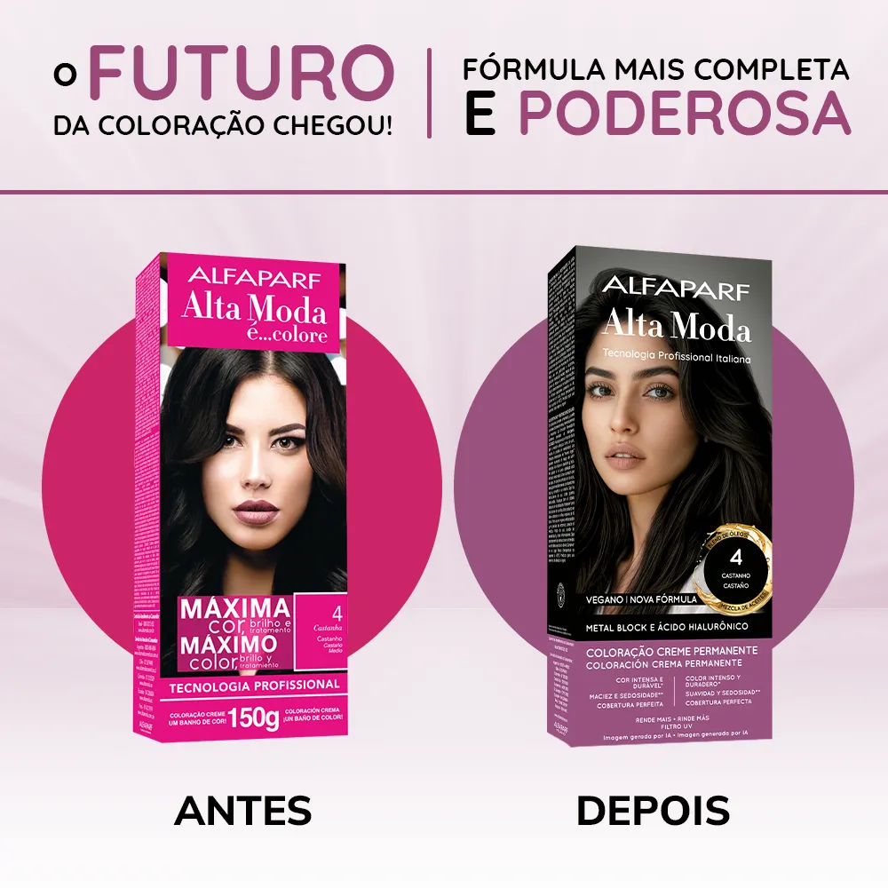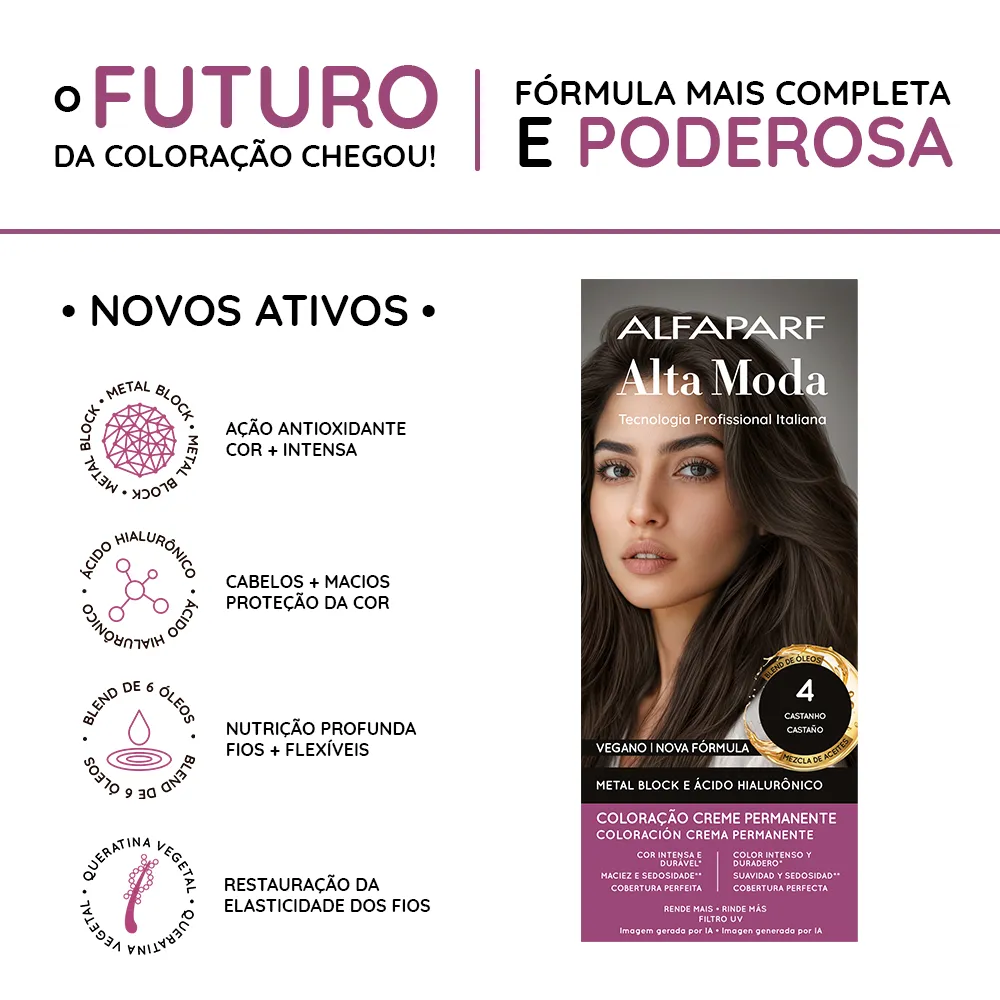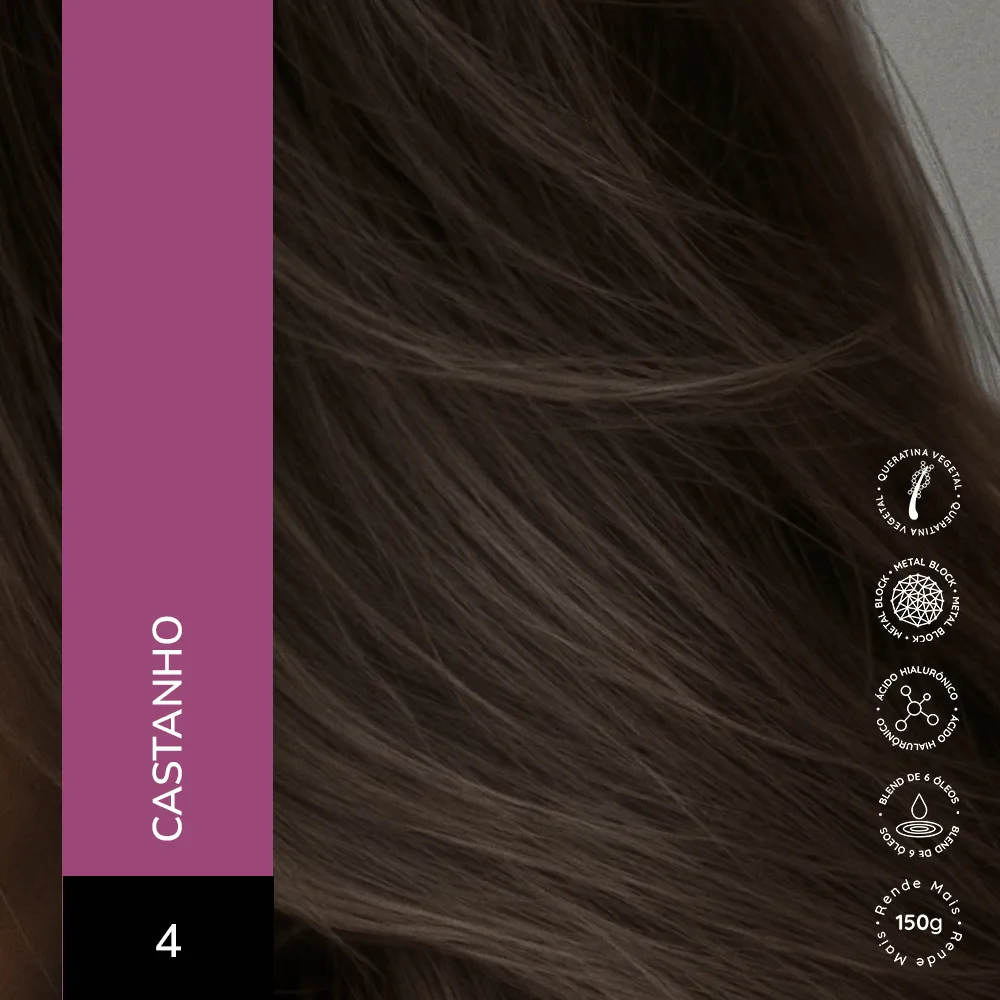 Coloração Creme Permanente que entrega cores intensas, vibrantes e com aparência mais saudável. Sua fórmula exclusiva combina a Tecnologia Metal Block, com ação antioxidante que ajuda a remover o acúmulo de metais pesados e impurezas dos fios, com o poder do Ácido Hialurônico, que garante maciez, sedosidade e proteção da cor. É enriquecida com um Blend de Óleos Nutritivos, composto por coco, macadâmia, oliva, abacate, girassol e argan, que proporcionam nutrição profunda, flexibilidade e fios visivelmente mais saudáveis.