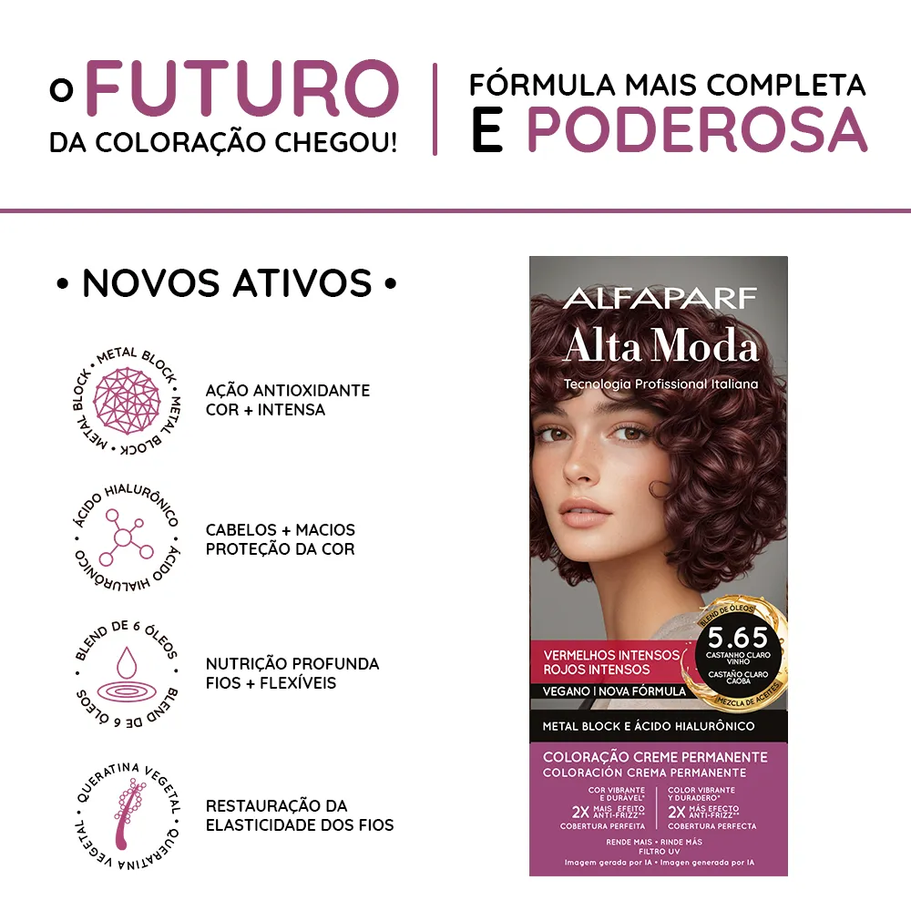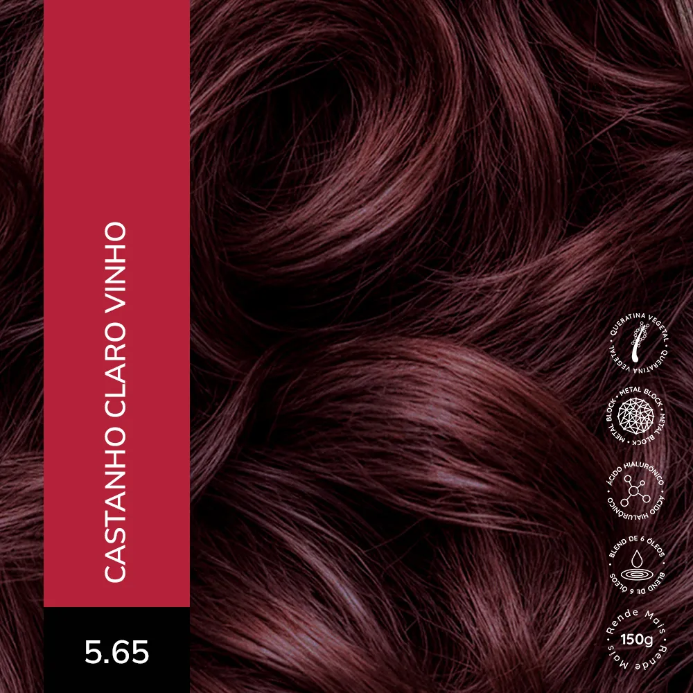 Coloração Creme Permanente que entrega cores intensas, vibrantes e com aparência mais saudável. Sua fórmula exclusiva combina a Tecnologia Metal Block, com ação antioxidante que ajuda a remover o acúmulo de metais pesados e impurezas dos fios, com o poder do Ácido Hialurônico, que garante maciez, sedosidade e proteção da cor. É enriquecida com um Blend de Óleos Nutritivos, composto por coco, macadâmia, oliva, abacate, girassol e argan, que proporcionam nutrição profunda, flexibilidade e fios visivelmente mais saudáveis.