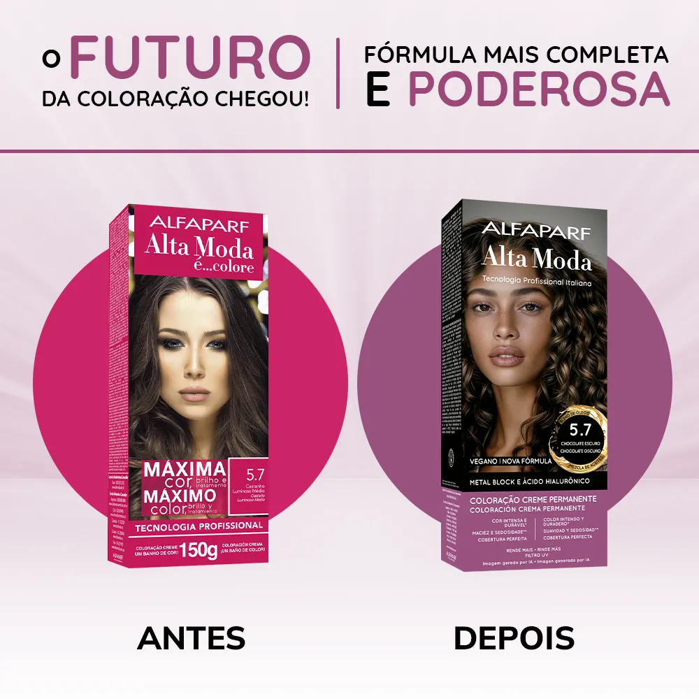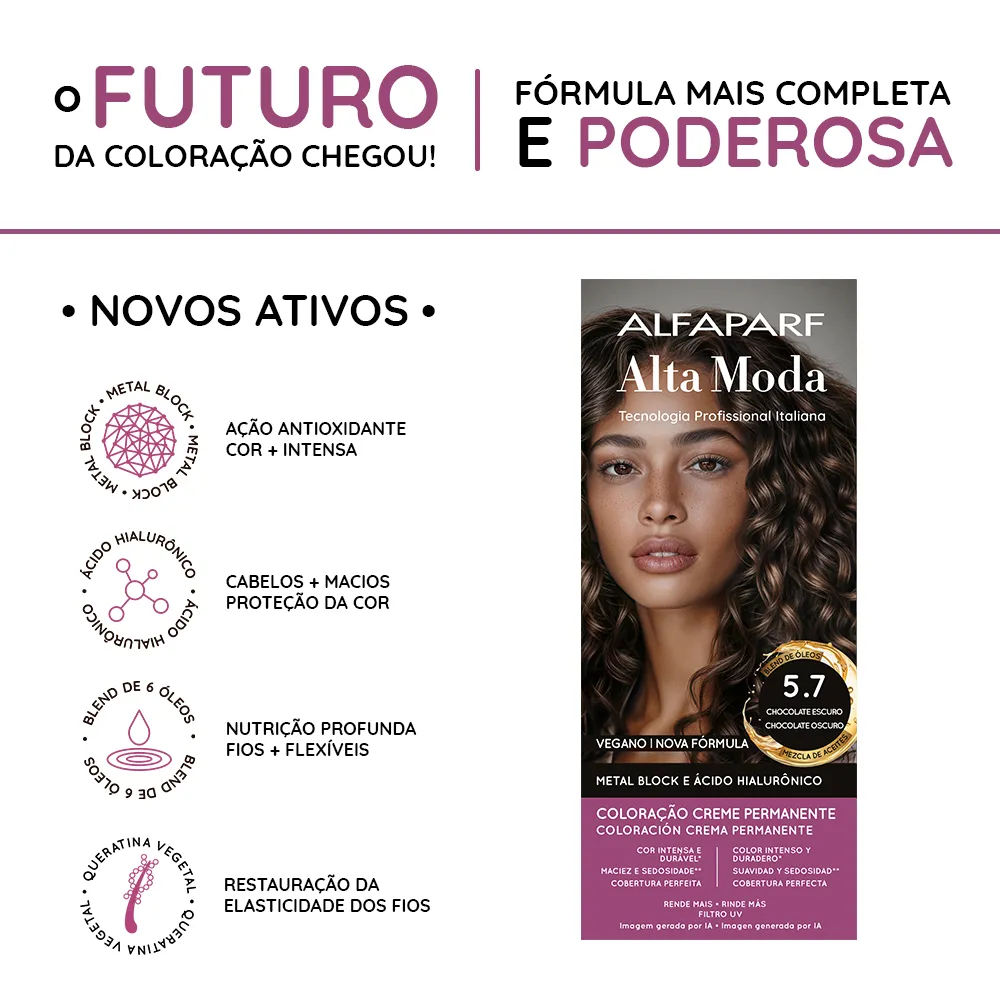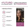 Coloração Creme Permanente que entrega cores intensas, vibrantes e com aparência mais saudável. Sua fórmula exclusiva combina a Tecnologia Metal Block, com ação antioxidante que ajuda a remover o acúmulo de metais pesados e impurezas dos fios, com o poder do Ácido Hialurônico, que garante maciez, sedosidade e proteção da cor. É enriquecida com um Blend de Óleos Nutritivos, composto por coco, macadâmia, oliva, abacate, girassol e argan, que proporcionam nutrição profunda, flexibilidade e fios visivelmente mais saudáveis.