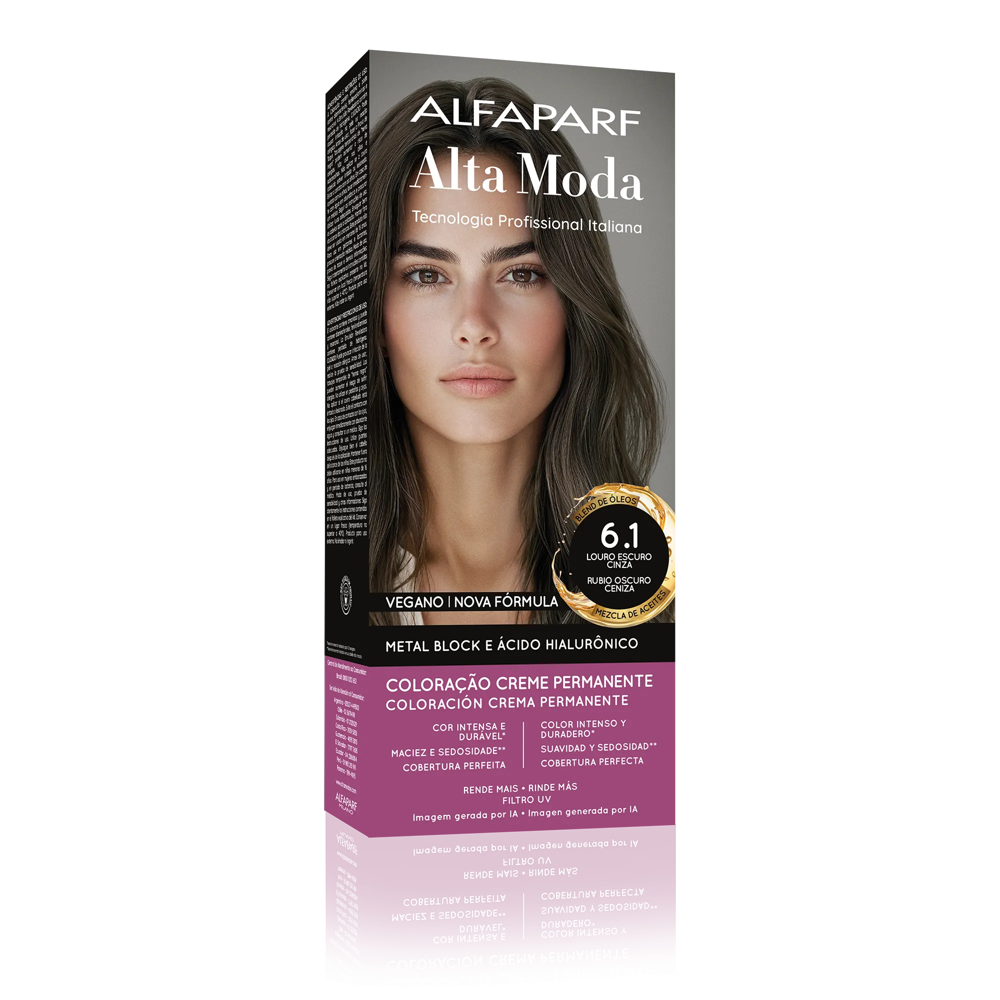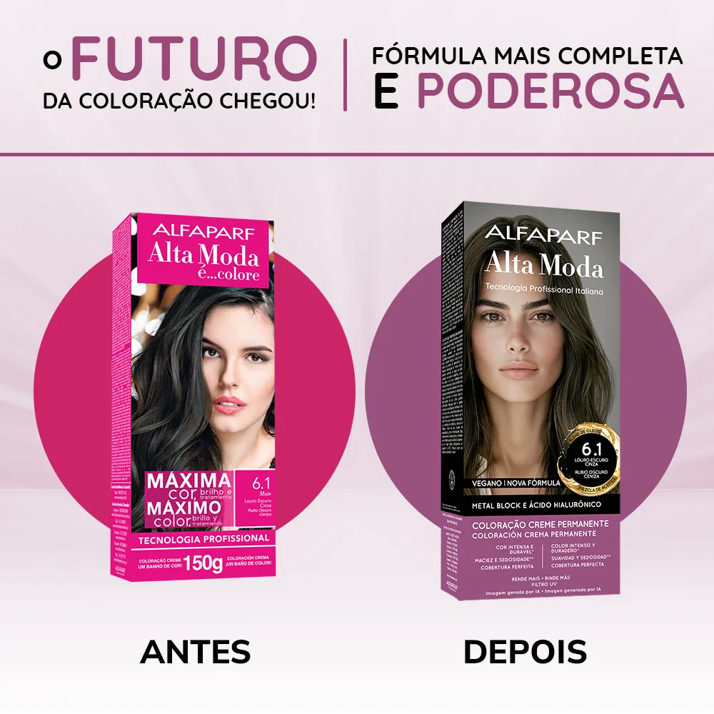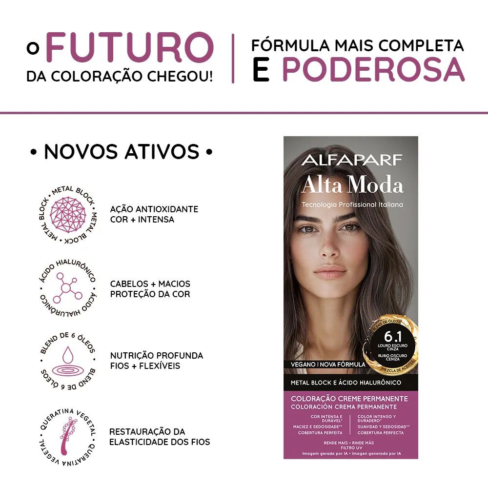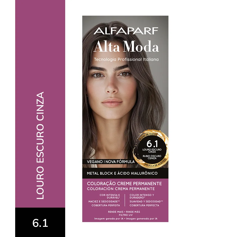 COMPOSIÇÃO / COMPOSICIÓN: Coloração Creme Permanente / Coloración Crema Permanente Alfaparf Alta Moda - Proc. ANVISA n˚.: 25351.451050/2024-88 - AQUA (WATER), CETEARYL ALCOHOL, PROPYLENE GLYCOL, CETEARETH-50, PEG-40 HYDROGENATED CASTOR OIL, AMMONIA, LAURYL ALCOHOL, MYRISTYL ALCOHOL, COCAMIDOPROPYL BETAINE, SODIUM SULFITE, PARFUM (FRAGRANCE), ERYTHORBIC ACID, POLYQUATERNIUM-22, P-PHENYLENEDIAMINE, ETHANOLAMINE, EDTA, RESORCINOL, 2-METHYLRESORCINOL, BISABOLOL, 2,4-DIAMINOPHENOXYETHANOL HCL, AMYL SALICYLATE, M-AMINOPHENOL, P-AMINOPHENOL, ETHYLHEXYL METHOXYCINNAMATE, HELIANTHUS ANNUUS (SUNFLOWER) SEED OIL, GLYCERIN, COCOS NUCIFERA (COCONUT) OIL, LINUM USITATISSIMUM (LINSEED) SEED OIL, SODIUM PCA, SODIUM LACTATE, SOY AMINO ACIDS, ARGININE, WHEAT AMINO ACIDS, ASPARTIC ACID, PCA, SERINE, THREONINE, ARGANIA SPINOSA KERNEL OIL, MACADAMIA TERNIFOLIA SEED OIL, OLEA EUROPAEA (OLIVE) FRUIT OIL, PERSEA GRATISSIMA (AVOCADO) OIL, ARGININE HCL, PENTYLENE GLYCOL, SODIUM HYALURONATE CROSSPOLYMER, HYDROLYZED RICE PROTEIN, PHYTIC ACID, ORYZA SATIVA (RICE) EXTRACT, GLYCINE, ALANINE, VALINE, SODIUM BENZOATE, ISOLEUCINE, PROLINE, TOCOPHEROL, HISTIDINE, PHENYLALANINE, POTASSIUM SORBATE.