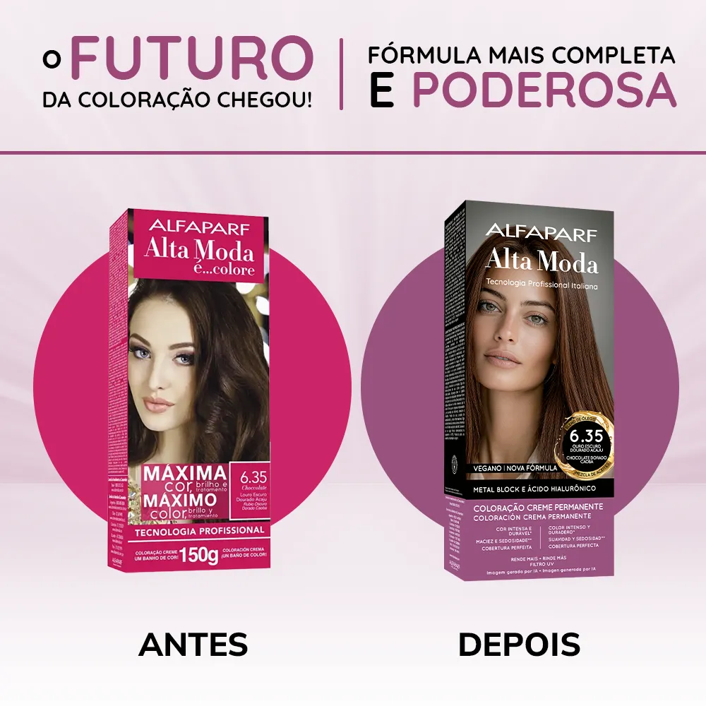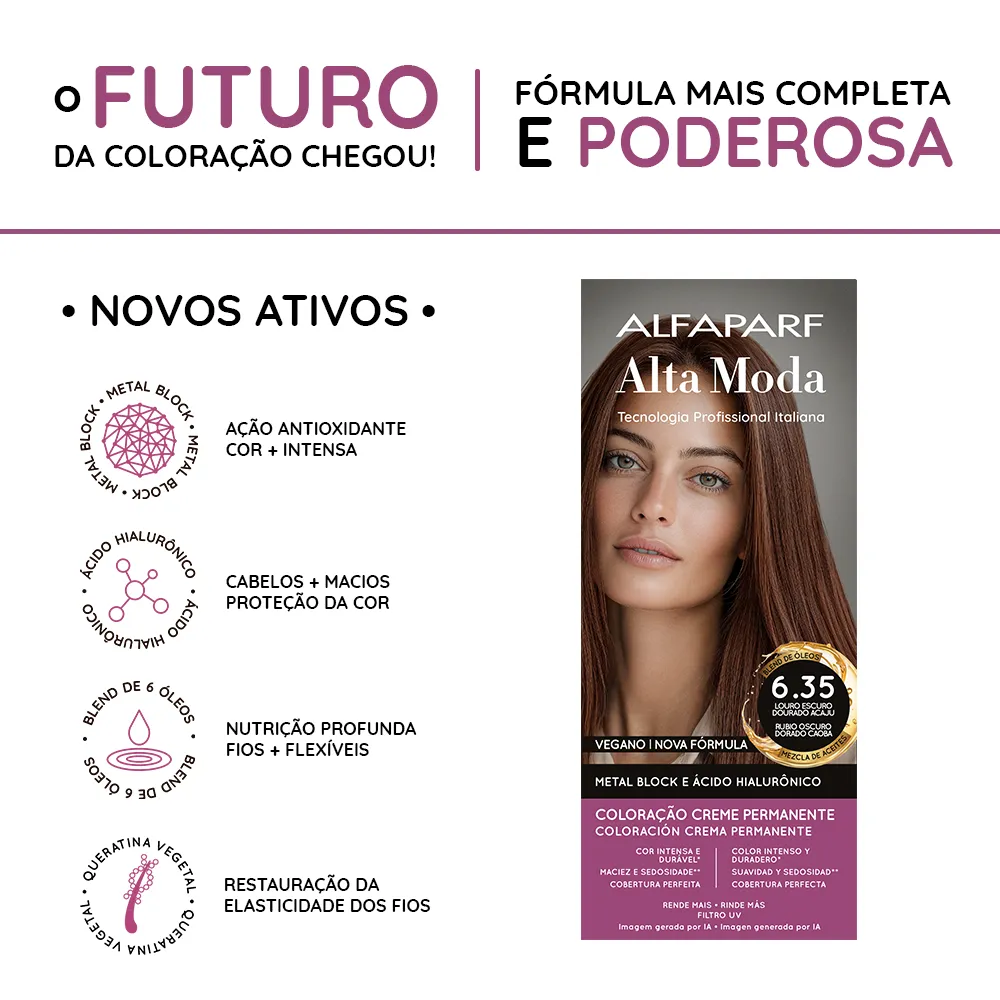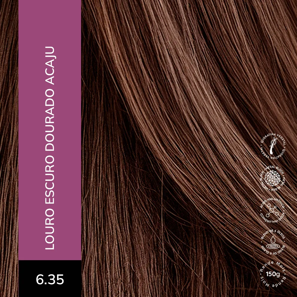 Coloração Creme Permanente que entrega cores intensas, vibrantes e com aparência mais saudável. Sua fórmula exclusiva combina a Tecnologia Metal Block, com ação antioxidante que ajuda a remover o acúmulo de metais pesados e impurezas dos fios, com o poder do Ácido Hialurônico, que garante maciez, sedosidade e proteção da cor. É enriquecida com um Blend de Óleos Nutritivos, composto por coco, macadâmia, oliva, abacate, girassol e argan, que proporcionam nutrição profunda, flexibilidade e fios visivelmente mais saudáveis.