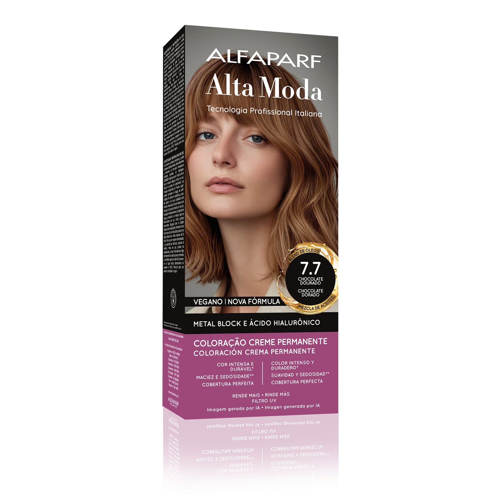 COMPOSIÇÃO / COMPOSICIÓN: Coloração Creme Permanente / Coloración Crema Permanente Alfaparf Alta Moda - Proc. ANVISA n˚.: 25351.451050/2024-88 - AQUA (WATER), CETEARYL ALCOHOL, PROPYLENE GLYCOL, CETEARETH-50, PEG-40 HYDROGENATED CASTOR OIL, AMMONIA, LAURYL ALCOHOL, MYRISTYL ALCOHOL, COCAMIDOPROPYL BETAINE, SODIUM SULFITE, TOLUENE-2,5-DIAMINE SULFATE, PARFUM (FRAGRANCE), ETHANOLAMINE, ERYTHORBIC ACID, POLYQUATERNIUM-22, EDTA, RESORCINOL, P-AMINOPHENOL, 2-METHYL-5-HYDROXYETHYLAMINOPHENOL, 2-METHYLRESORCINOL, BISABOLOL, M-AMINOPHENOL, AMYL SALICYLATE, ETHYLHEXYL METHOXYCINNAMATE, HELIANTHUS ANNUUS (SUNFLOWER) SEED OIL, GLYCERIN, 2,4-DIAMINOPHENOXYETHANOL HCL, COCOS NUCIFERA (COCONUT) OIL, LINUM USITATISSIMUM (LINSEED) SEED OIL, SODIUM PCA, SODIUM LACTATE, SOY AMINO ACIDS, ARGININE, WHEAT AMINO ACIDS, ASPARTIC ACID, PCA, SERINE, THREONINE, ARGANIA SPINOSA KERNEL OIL, MACADAMIA TERNIFOLIA SEED OIL, OLEA EUROPAEA (OLIVE) FRUIT OIL, PERSEA GRATISSIMA (AVOCADO) OIL, ARGININE HCL, PENTYLENE GLYCOL, SODIUM HYALURONATE CROSSPOLYMER, HYDROLYZED RICE PROTEIN, PHYTIC ACID, ORYZA SATIVA (RICE) EXTRACT, GLYCINE, ALANINE, VALINE, SODIUM BENZOATE, ISOLEUCINE, PROLINE, TOCOPHEROL, HISTIDINE, PHENYLALANINE, POTASSIUM SORBATE.