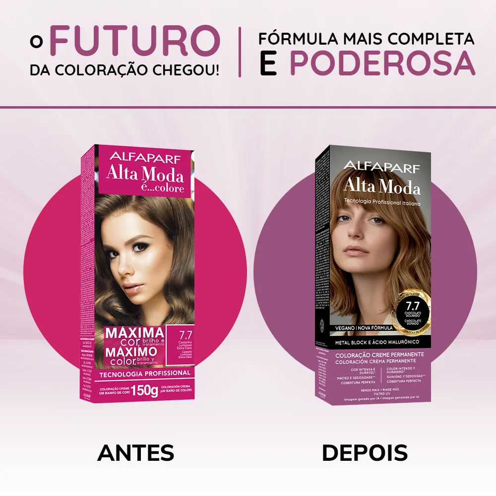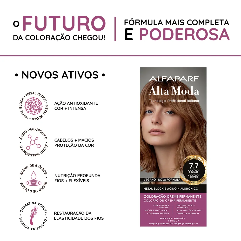 Coloração Creme Permanente que entrega cores intensas, vibrantes e com aparência mais saudável. Sua fórmula exclusiva combina a Tecnologia Metal Block, com ação antioxidante que ajuda a remover o acúmulo de metais pesados e impurezas dos fios, com o poder do Ácido Hialurônico, que garante maciez, sedosidade e proteção da cor. É enriquecida com um Blend de Óleos Nutritivos, composto por coco, macadâmia, oliva, abacate, girassol e argan, que proporcionam nutrição profunda, flexibilidade e fios visivelmente mais saudáveis.