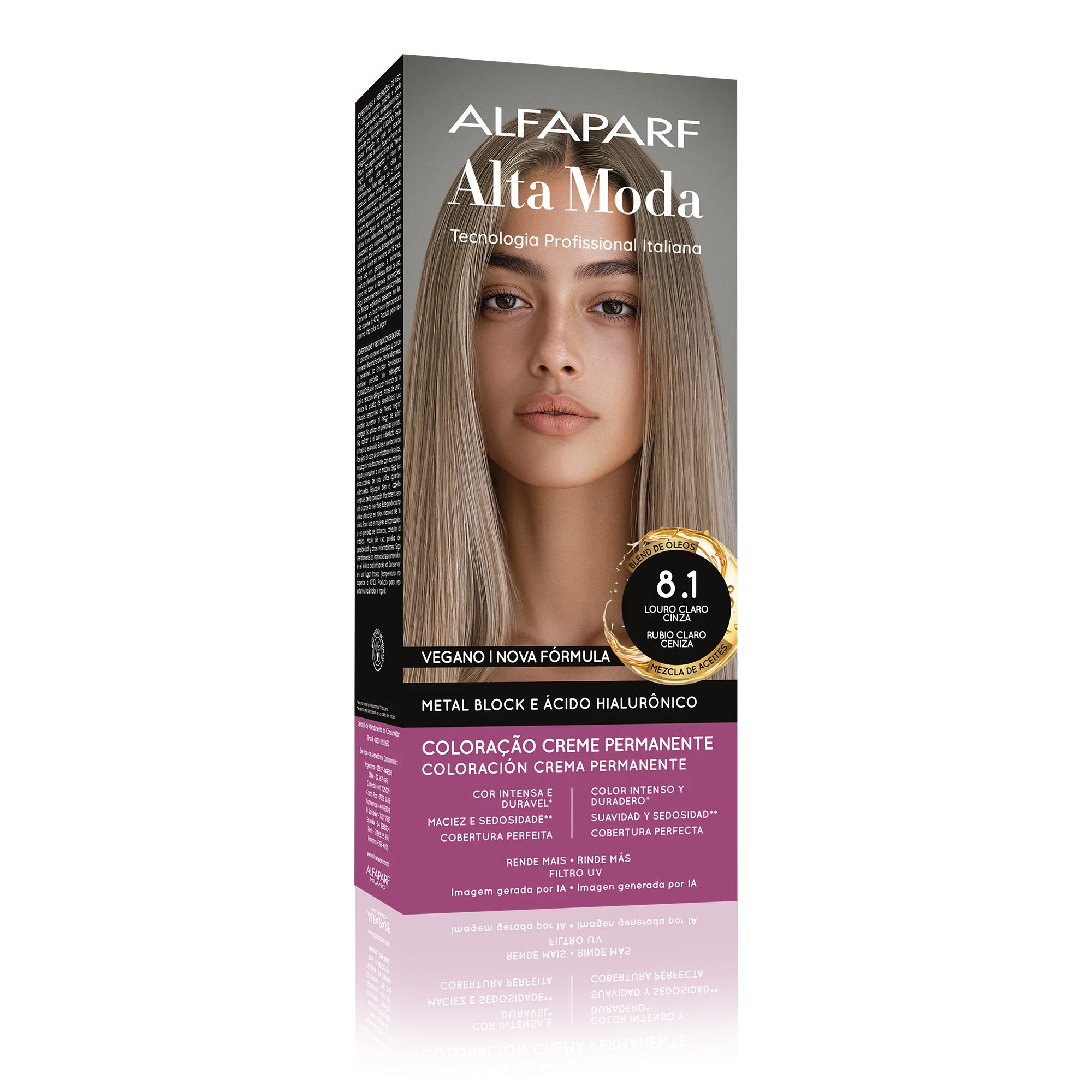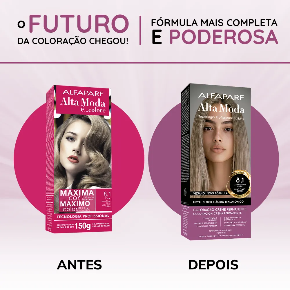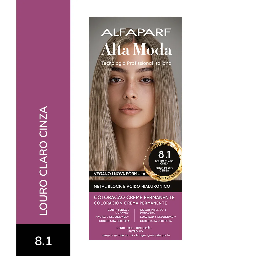 COMPOSIÇÃO / COMPOSICIÓN: Coloração Creme Permanente / Coloración Crema Permanente Alfaparf Alta Moda - Proc. ANVISA n˚.: 25351.451050/2024-88 - AQUA (WATER), CETEARYL ALCOHOL, PROPYLENE GLYCOL, CETEARETH-50, PEG-40 HYDROGENATED CASTOR OIL, AMMONIA, LAURYL ALCOHOL, MYRISTYL ALCOHOL, COCAMIDOPROPYL BETAINE, SODIUM SULFITE, PARFUM (FRAGRANCE), ERYTHORBIC ACID, POLYQUATERNIUM-22, ETHANOLAMINE, EDTA, P-PHENYLENEDIAMINE, RESORCINOL, BISABOLOL, 2-METHYLRESORCINOL, AMYL SALICYLATE, P-AMINOPHENOL, 2,4-DIAMINOPHENOXYETHANOL HCL, ETHYLHEXYL METHOXYCINNAMATE, HELIANTHUS ANNUUS (SUNFLOWER) SEED OIL, GLYCERIN, COCOS NUCIFERA (COCONUT) OIL, LINUM USITATISSIMUM (LINSEED) SEED OIL, SODIUM PCA, SODIUM LACTATE, SOY AMINO ACIDS, ARGININE, WHEAT AMINO ACIDS, ASPARTIC ACID, PCA, SERINE, THREONINE, ARGANIA SPINOSA KERNEL OIL, MACADAMIA TERNIFOLIA SEED OIL, OLEA EUROPAEA (OLIVE) FRUIT OIL, PERSEA GRATISSIMA (AVOCADO) OIL, ARGININE HCL, PENTYLENE GLYCOL, SODIUM HYALURONATE CROSSPOLYMER, HYDROLYZED RICE PROTEIN, PHYTIC ACID, ORYZA SATIVA (RICE) EXTRACT, GLYCINE, ALANINE, VALINE, SODIUM BENZOATE, ISOLEUCINE, PROLINE, TOCOPHEROL, HISTIDINE, PHENYLALANINE, POTASSIUM SORBATE.