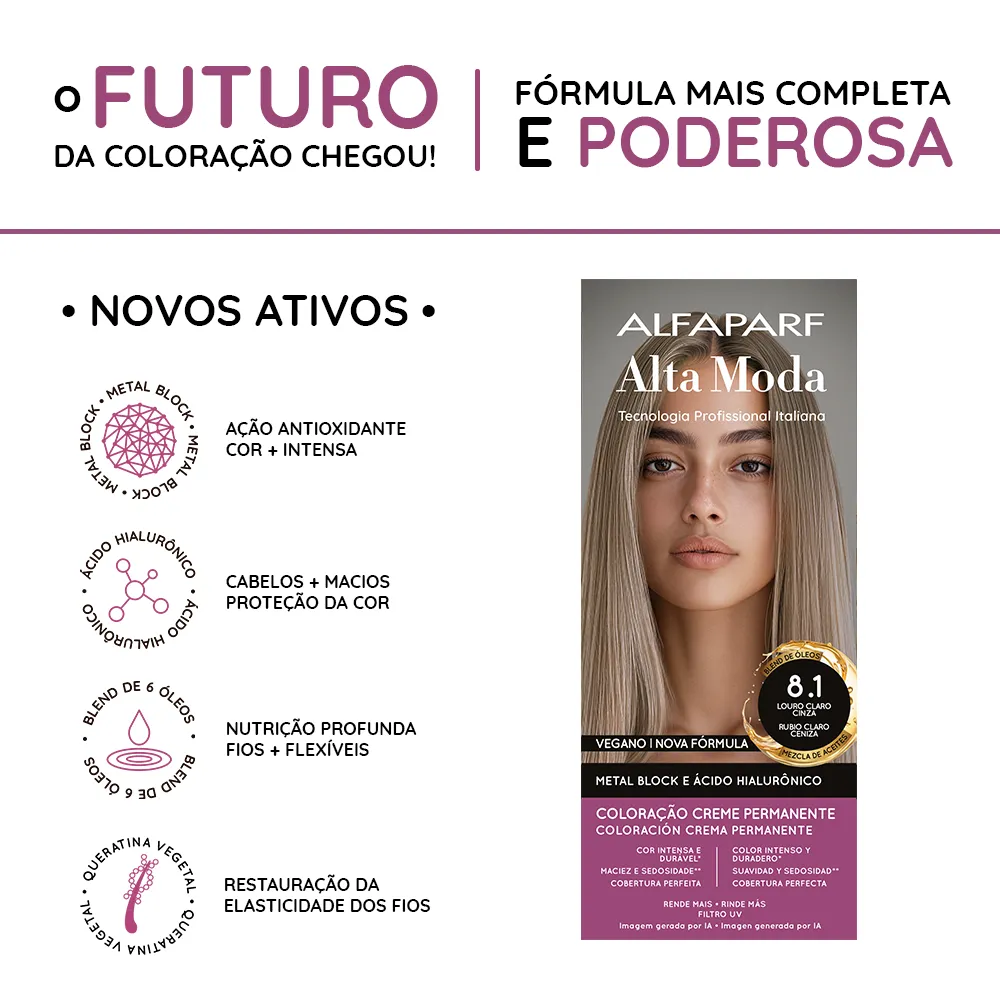 Coloração Creme Permanente que entrega cores intensas, vibrantes e com aparência mais saudável. Sua fórmula exclusiva combina a Tecnologia Metal Block, com ação antioxidante que ajuda a remover o acúmulo de metais pesados e impurezas dos fios, com o poder do Ácido Hialurônico, que garante maciez, sedosidade e proteção da cor. É enriquecida com um Blend de Óleos Nutritivos, composto por coco, macadâmia, oliva, abacate, girassol e argan, que proporcionam nutrição profunda, flexibilidade e fios visivelmente mais saudáveis.