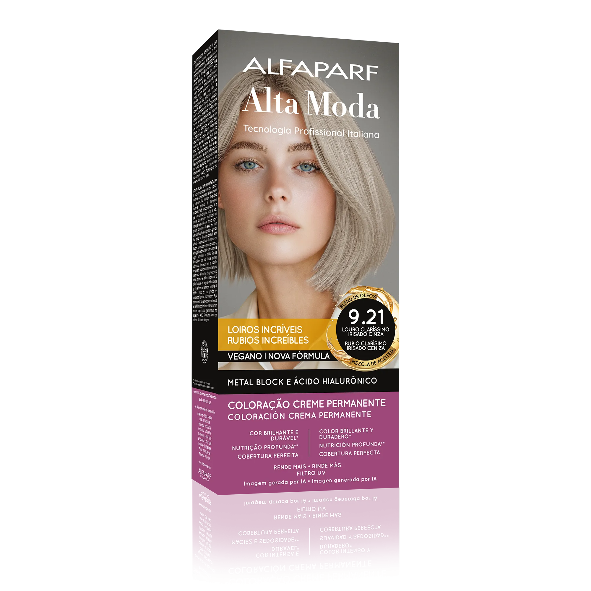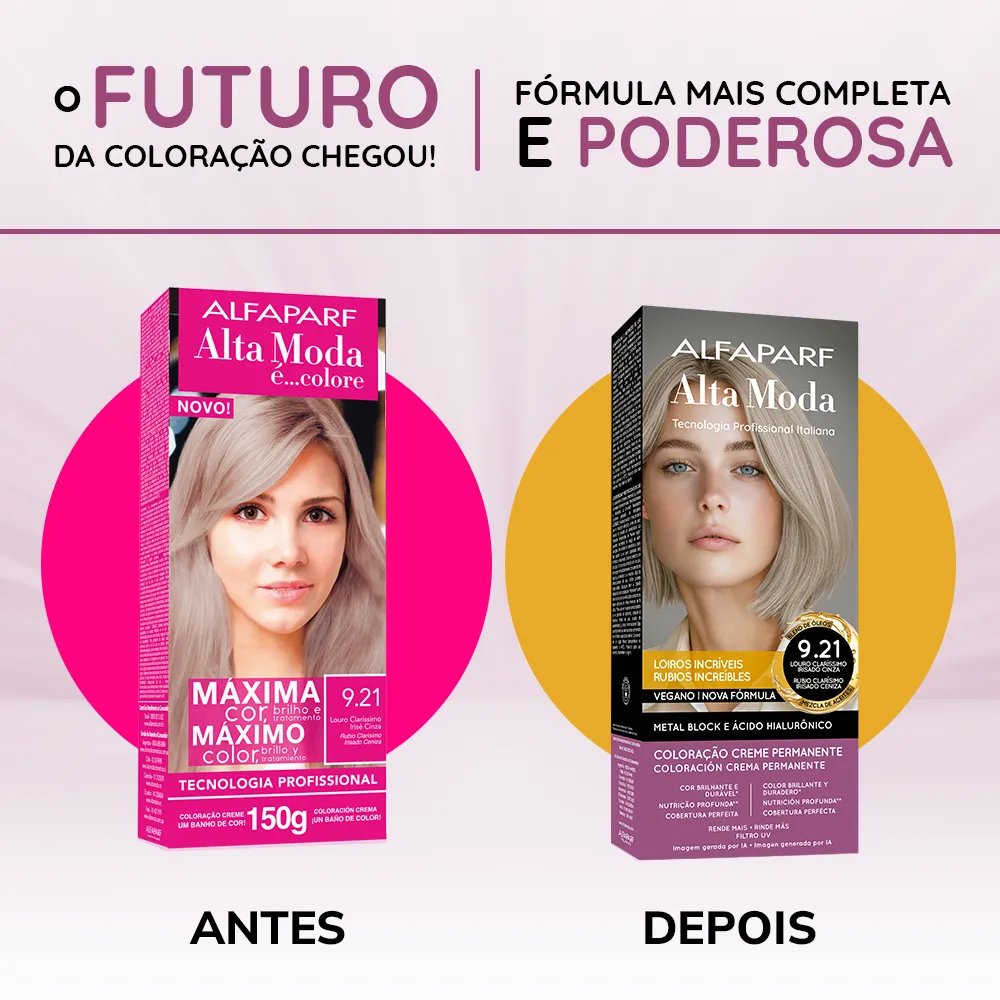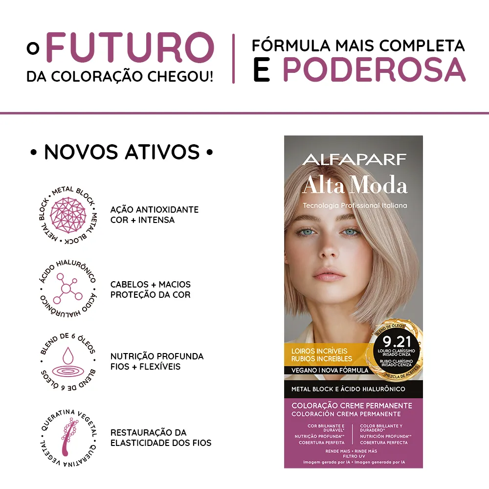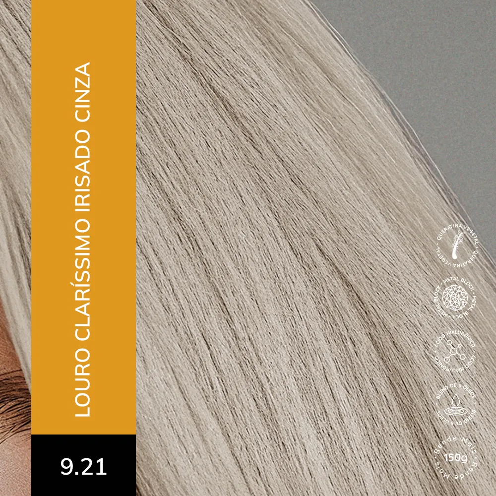 Coloração Creme Permanente que entrega cores intensas, vibrantes e com aparência mais saudável. Sua fórmula exclusiva combina a Tecnologia Metal Block, com ação antioxidante que ajuda a remover o acúmulo de metais pesados e impurezas dos fios, com o poder do Ácido Hialurônico, que garante maciez, sedosidade e proteção da cor. É enriquecida com um Blend de Óleos Nutritivos, composto por coco, macadâmia, oliva, abacate, girassol e argan, que proporcionam nutrição profunda, flexibilidade e fios visivelmente mais saudáveis.