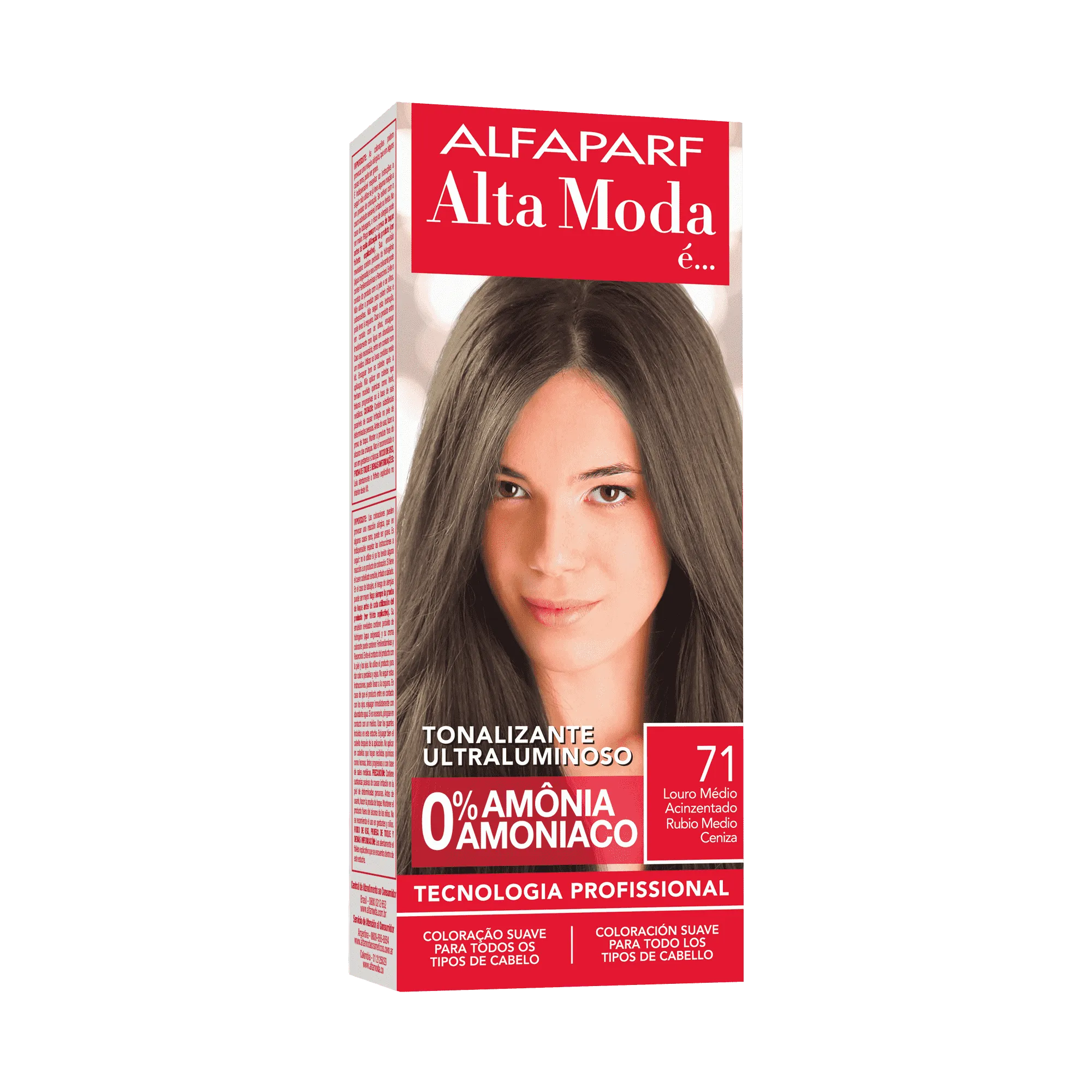 ALTA MODA é…Tonalizante Ultraluminoso. 0% amônia. Tecnologia Profissional Italiana. Tonaliza os cabelos de forma prática, segura e moderna, com cores intensas e ultraluminosas, sem danificar a beleza natural dos fios. Cor sem agressão para todo tipo de cabelo – Inclusive os alisados. Sistema Alfa Multi-lamellare que garante a intensidade da cor, seu brilho e resistência às lavagens.