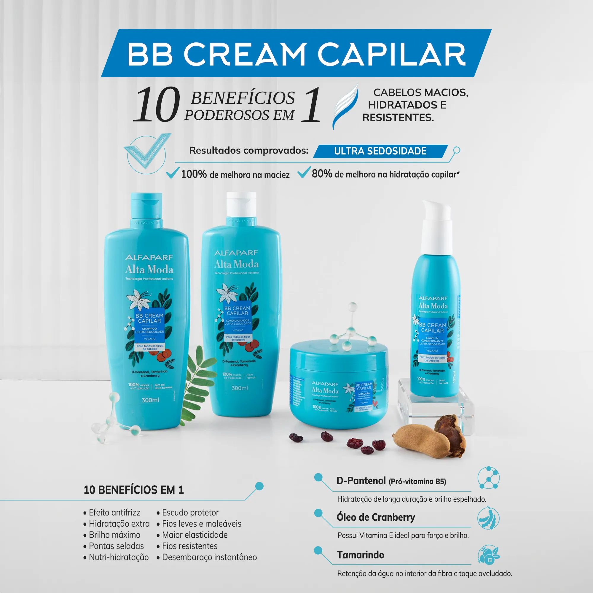 Alta Moda BB Cream é um tratamento com ação poderosa e multifuncional, que oferece os 10 benefícios mais desejados para cabelos totalmente revitalizados!