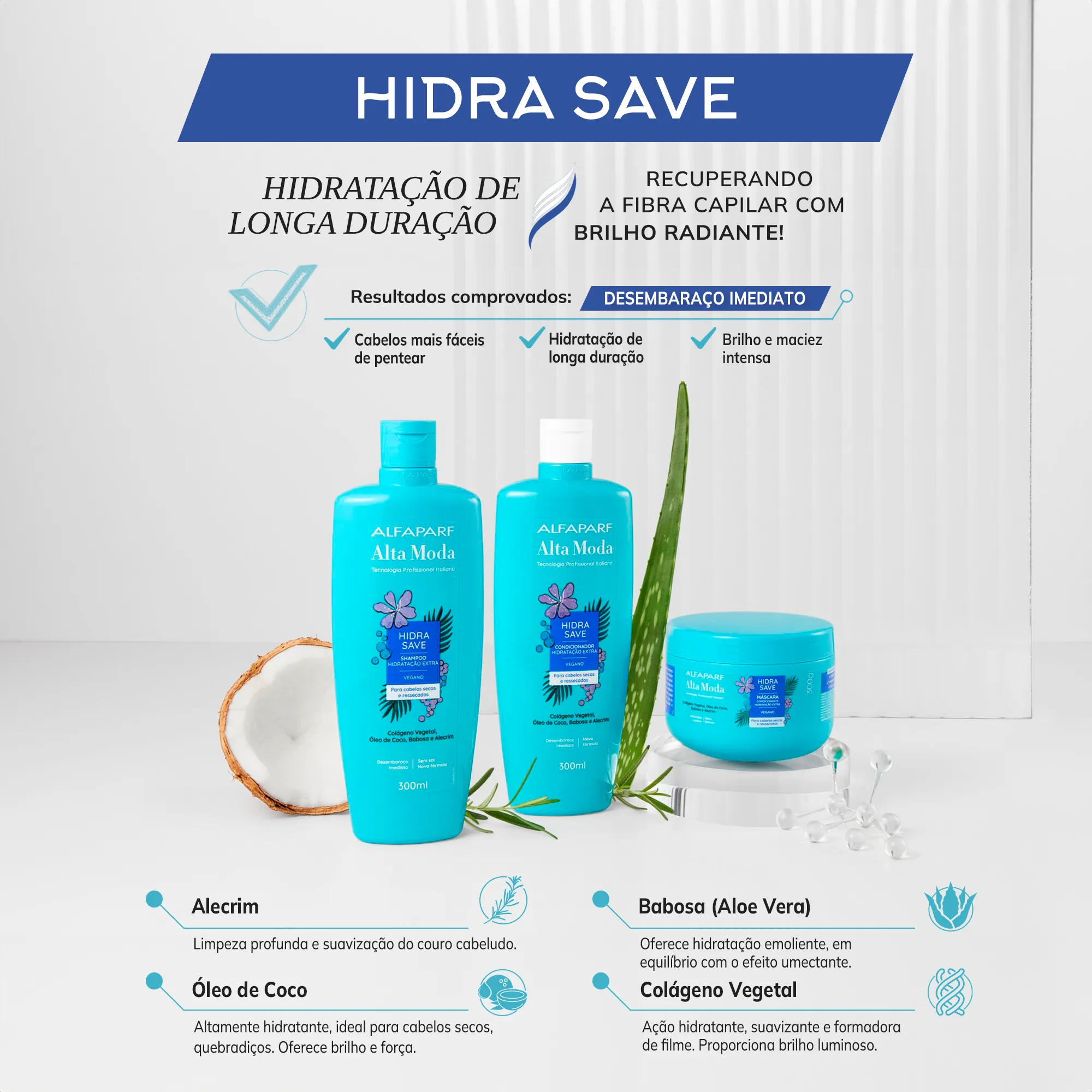 Alta Moda Hidra Save recupera a hidratação em todas as camadas da fibra e devolve o brilho radiante dos cabelos ultra saudáveis!