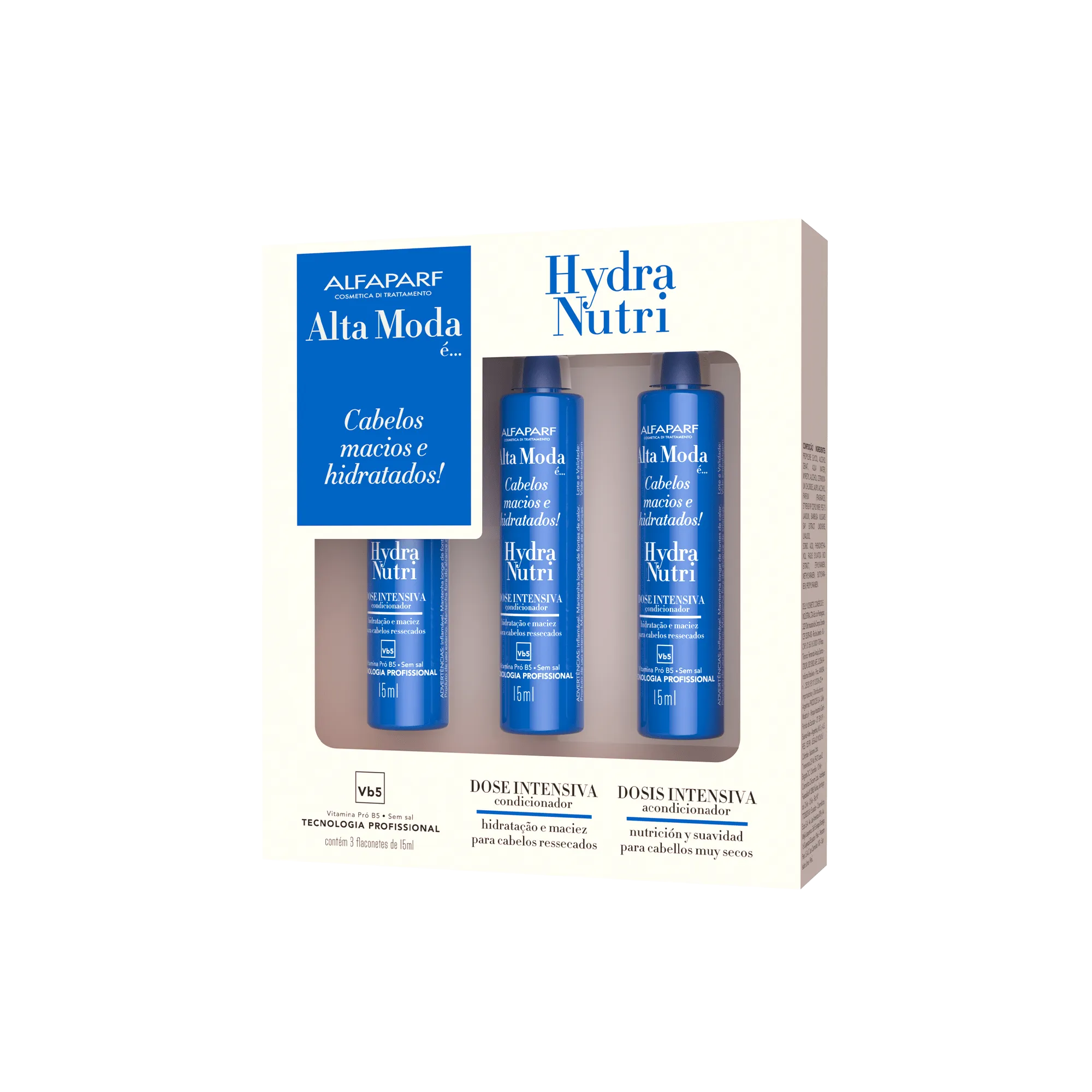 Alta Moda é… Hydra Nutri. Tecnología Profesional Italiana. Tratamiento de nutrición rico y profundo, resultado inmediato en una sola aplicación. Nutrición y suavidad para cabellos muy secos. Dosis intensiva para reposición hídrica de choque, proporciona hydratación intensa e immediata. Con vitamina pro B5, sin sal.
