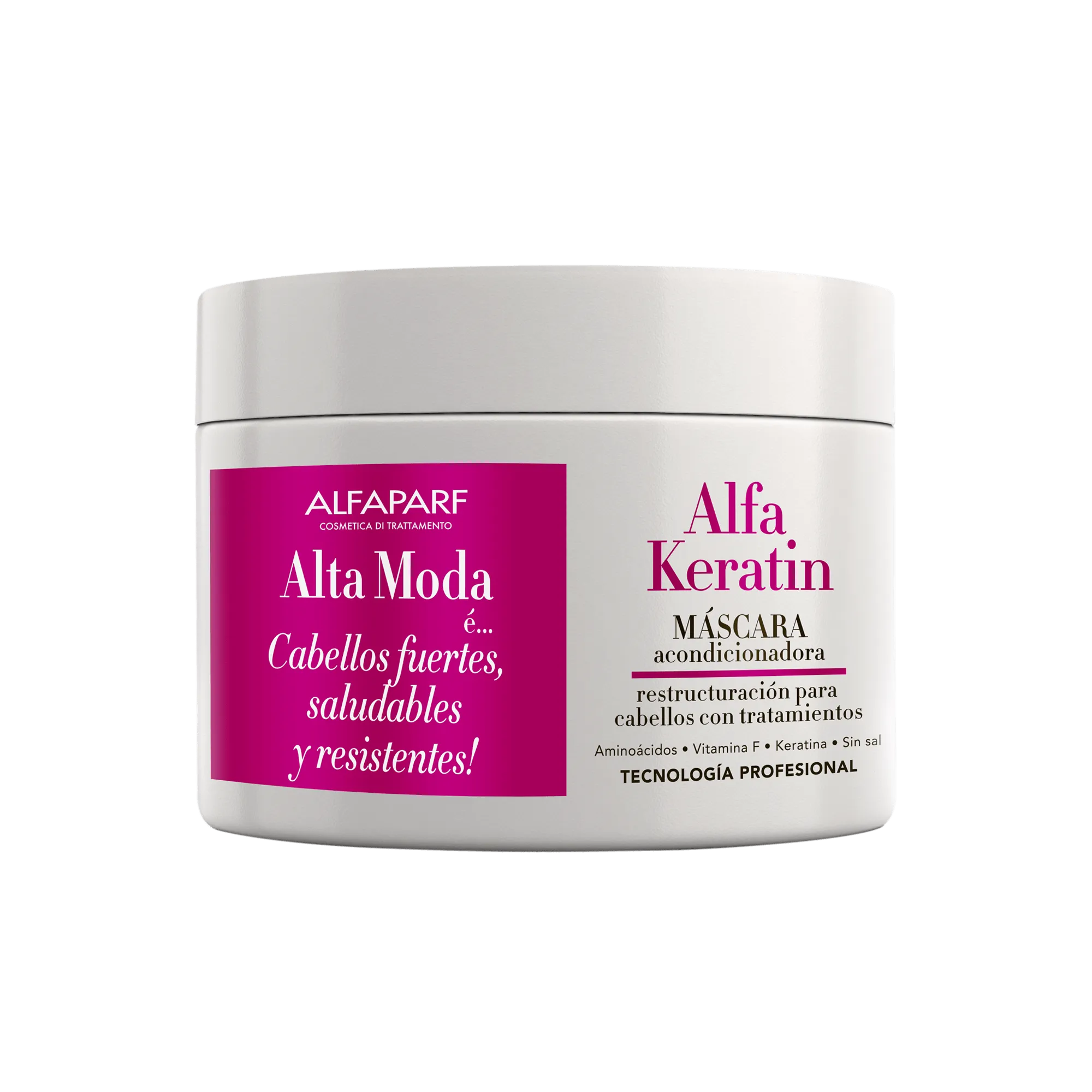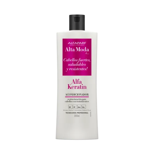 Alta Moda é… Alfakeratin. Tecnología Profesional Italiana. Para cabellos modificados por alisados progresivos y que requieren un mantenimiento preventivo diario o para los cabellos que han sido desvitalizados por productos químicos de alisados agresivos. Reestructura la matriz proteica del cabello, cuidando el cabello debilitado, con puntas abiertas y desvitalizados. Brillo, resistencia y suavidad. Fórmula con ARGININA, QUERATINA Y VITAMINAS,