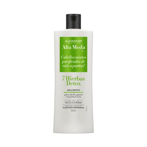 Alta Moda é…7 HIERBAS DETOX. Tecnología Profesional Italiana. Trata las raíces oleosas y su nutrición sin dejar un aspecto oleoso para el cabello. Evita cargas estáticas/frizz/electricidad. Trata en profundidad la estructura del cabello desde las raíces hasta las puntas sin dejar el cabello oleoso. Acción inteligente, elimina la oleosidad de las raíces cuidando las puntas de forma equilibrada. Con 7 hierbas, de acción lenitiva, emoliente y suavizante. Trata el cabello sin resecarlo y su acción permite que se mantenga limpio por más tiempo, para evitar lavados constantes.