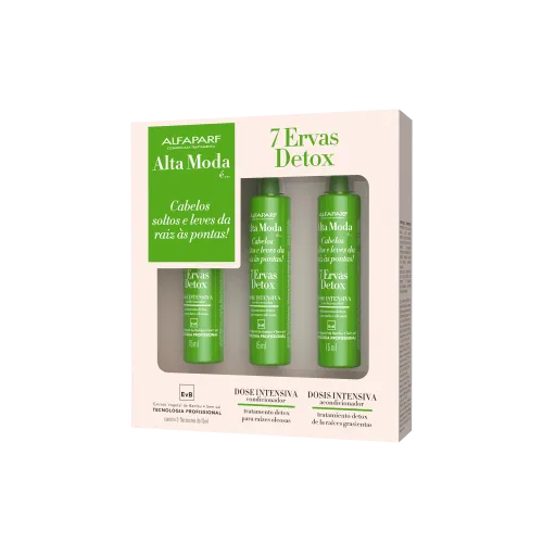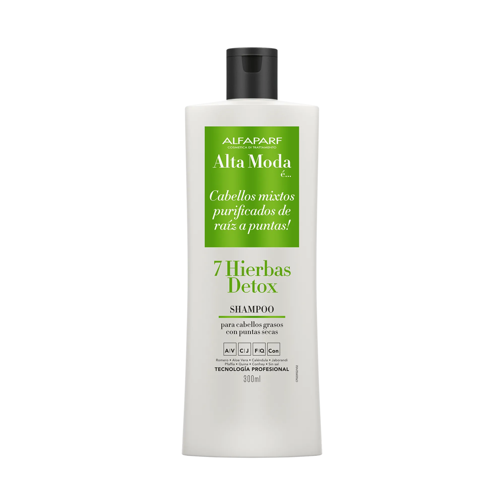 Alta Moda é…7 HIERBAS DETOX. Tecnología Profesional Italiana. Trata las raíces oleosas y su nutrición sin dejar un aspecto oleoso para el cabello. Salud y belleza, con un equilibrio total entre las raíces y las puntas. Acción inteligente, elimina la oleosidad de las raíces y cuida las puntas de forma equilibrada. Con 7 hierbas, de acción lenitiva, emoliente y suavizante. Trata el cabello sin resecarlo y su acción permite que se mantenga limpio por más tiempo, para evitar lavados constantes.