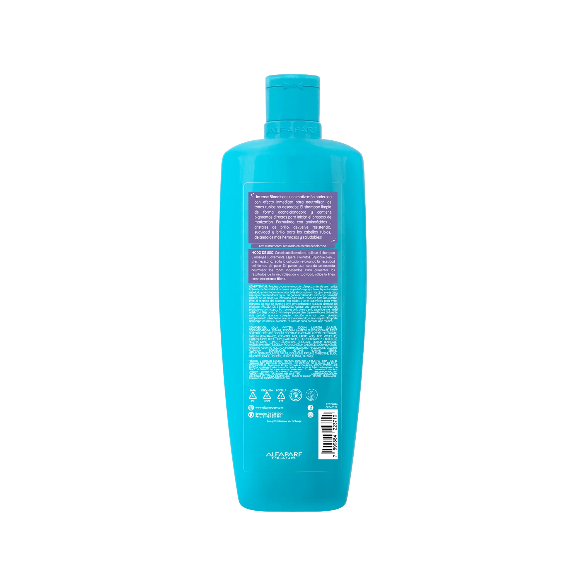 Intense Blond limpia de forma acondicionadora y contiene pigmentos directos para iniciar el proceso de matización.